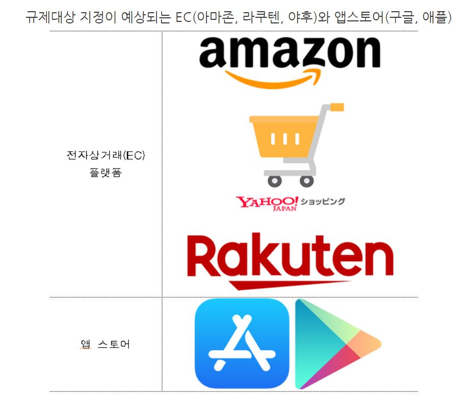 규제 대상은 일본 국내매출이 연간 3000억 엔(한화 약 3조 1269억 원) 이상인 대규모 온라인 쇼핑몰, 2000억 엔(한화 약 2조 846억 원) 이상의 앱 스토어 운영사다.