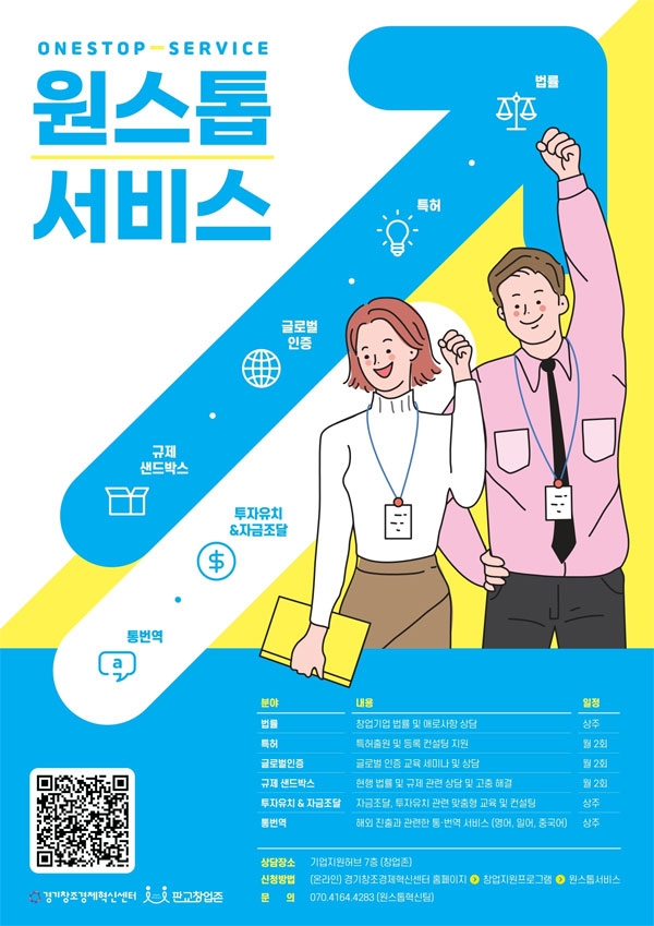 원스톱 서비스의 상담분야는 법률, 투자유치 및 자금조달, 특허 등록, 글로벌 인증, 규제 샌드박스, 통번역 등 6개 영역이다.