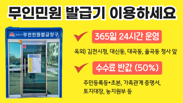 김천시가 무원민원발급기를 통해 민원서류 108종에 대해 수수료 반값 및 365일 24시간 사용이 가능하도록 지원한다.