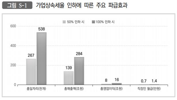 중소기업중앙회와 파이터치연구원은 ‘기업상속세 감면에 따른 경제적 파급효과’ 연구보고서를 통해 현행 기업의 상속세율을 50% 인하하면 총 일자리 26만 7000개, 총매출액 139조 원, 직장인 월급 7000원 이 상승한다고 밝혔다.