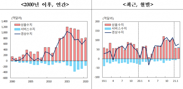 한국은행이 발표한 ‘2021년 2월 국제수지’(잠정)에 따르면, 2월 경상수지는 80억 3000만 달러(한화 약 9조 56억 원)의 흑자를 기록한 것으로 집계됐다.