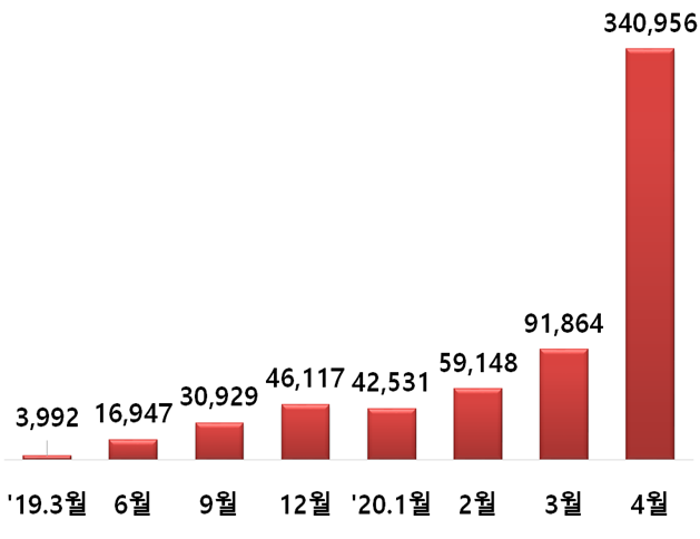 4월 일평균 결제액은 34억 1000만 원으로 2019년 4월의 8500만 원 대비 40배 이상 증가했다.