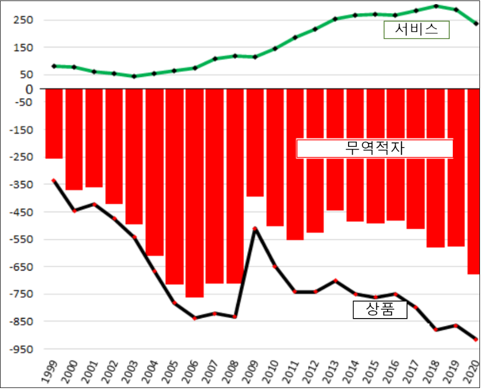 적자였던 상품 부문은 510억 달러(한화 약 56조 8650억 원) 증가했고, 흑자였던 서비스 부문은 500억 달러(한화 약 55조 7500억 원) 감소했다.