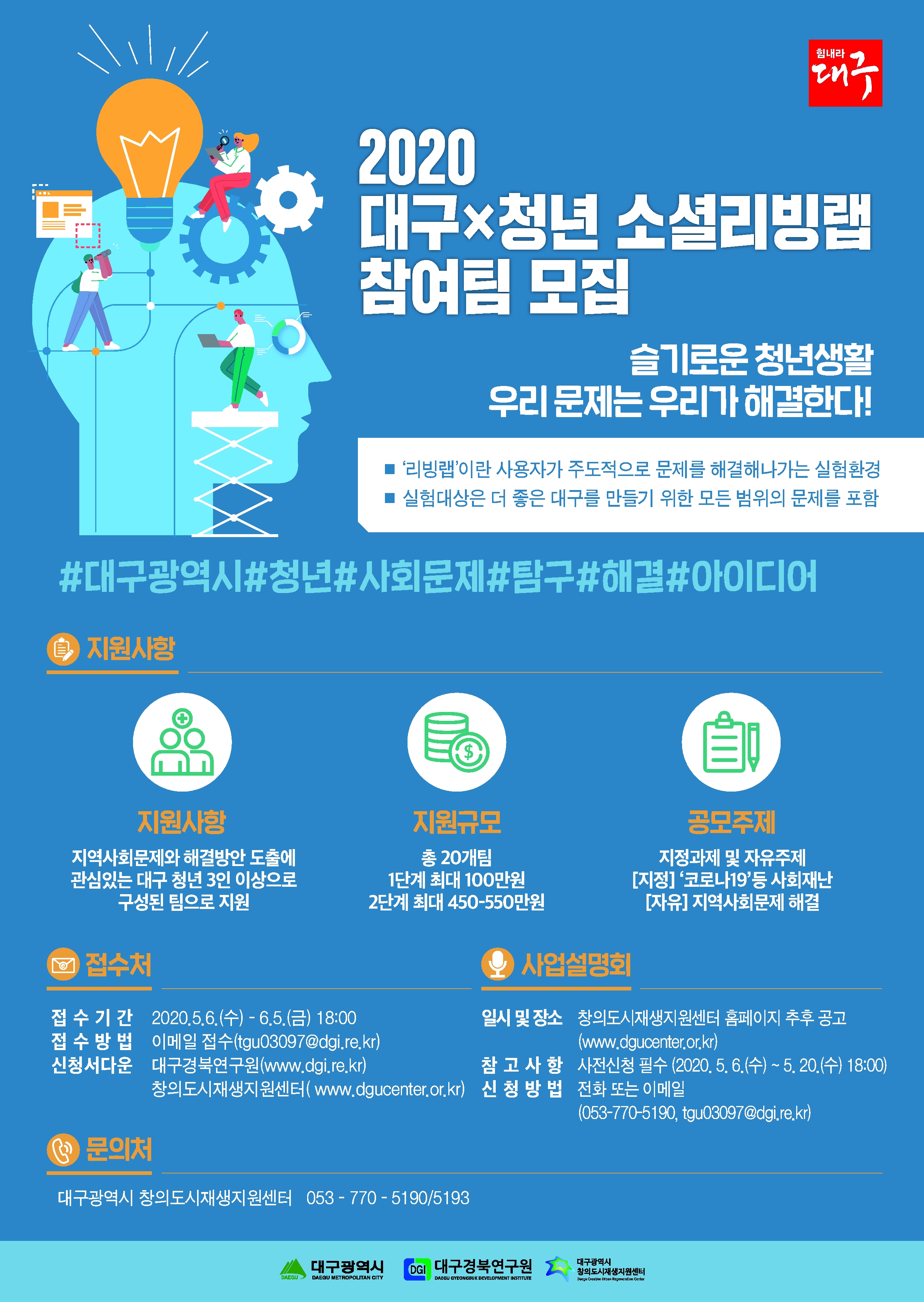참가팀은 대구시 공모‧모집 상세 정보 ‘2020년 「대구X청년 소셜리빙랩 」 참여팀 모집’과 창의도시재생지원센터, 대구경북연구원에서 신청서를 받을 수 있다.