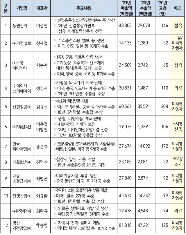 소형 모빌리티용 부품 제조사로 매출 중 미국 수출 비중이 49%에 달하는 진명산업과 미래자동차용 제품, 생산설비 자동화에 나선 대광소결금속㈜, 분말사출성형 분야 국내 1위 기업 한국피아이엠도 포함됐다.