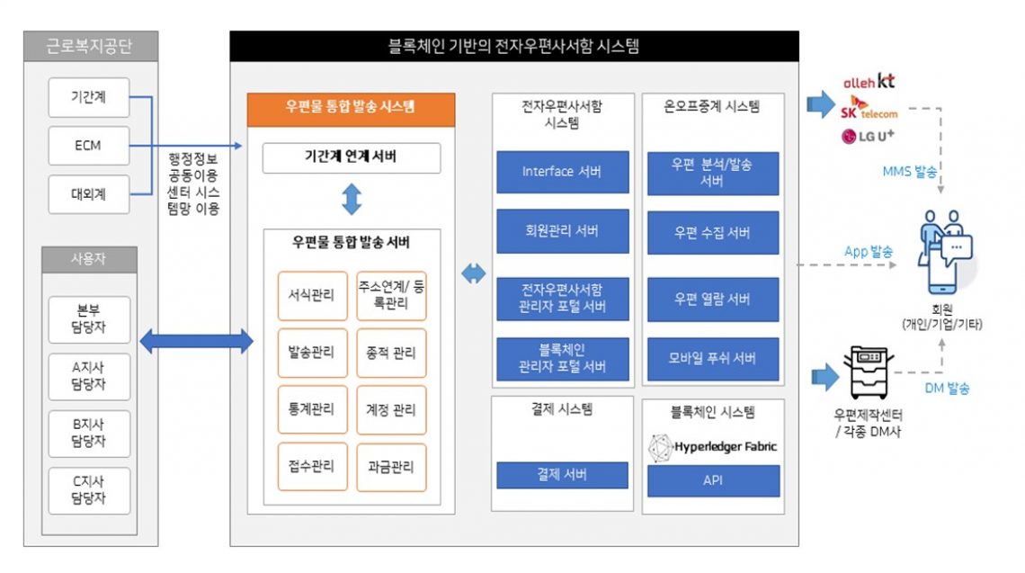 ‘지능형 우편물 통합관리서비스’는 빅데이터(Bigdata)와 인공지능(AI) 기술이 융합된 온라인 맞춤형 우편서비스와 블록체인(Blockchain) 기반으로 보안(위변조‧부인 방지) 서비스가 결합된 디지털화 우편통합 서비스다.