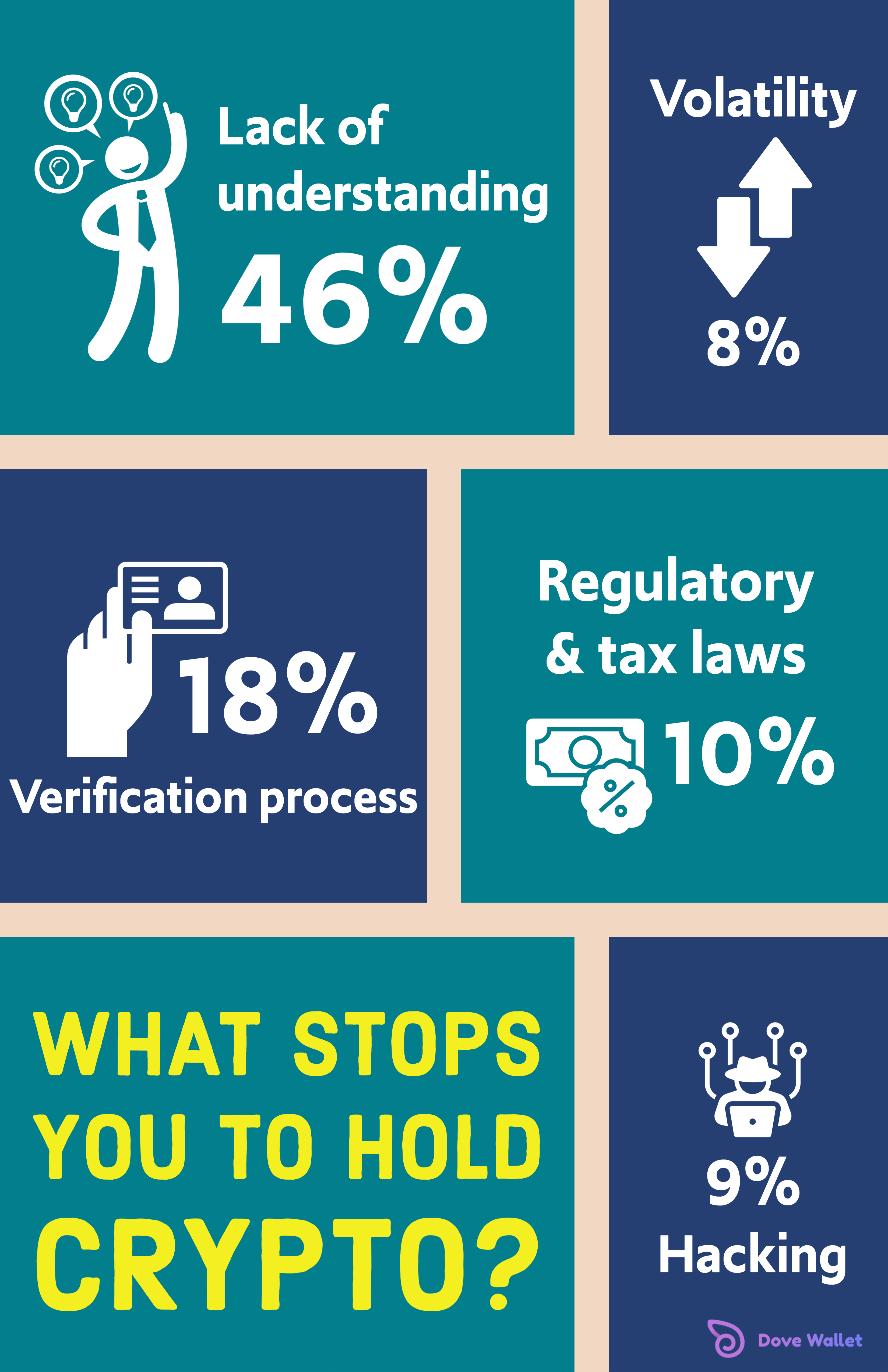 최근 비둘기 지갑이 전세계 이용자 4,622명을 대상으로 ‘디지털자산 보유를 주저하게 만드는 가장 큰 요인’을 묻는 설문조사를 실시한 결과, 전체 응답자 중 46%가 ‘디지털자산에 대한 이해 부족’을 가장 큰 이유로 선택했다. 또한 18%의 응답자는 디지털자산을 구매할 시 요구되는 복잡한 인증절차가 보유를 주저하게 만드는 요인이라고 답했다. 이 밖에도 각종 규제나 법령, 과세정책의 불확실성, 높은 변동성, 해킹 등의 보안사고 등을 디지털자산 보유를 가로막는 장애요인으로 꼽은 이용자도 각 10%, 8%, 9%를 기록했다.