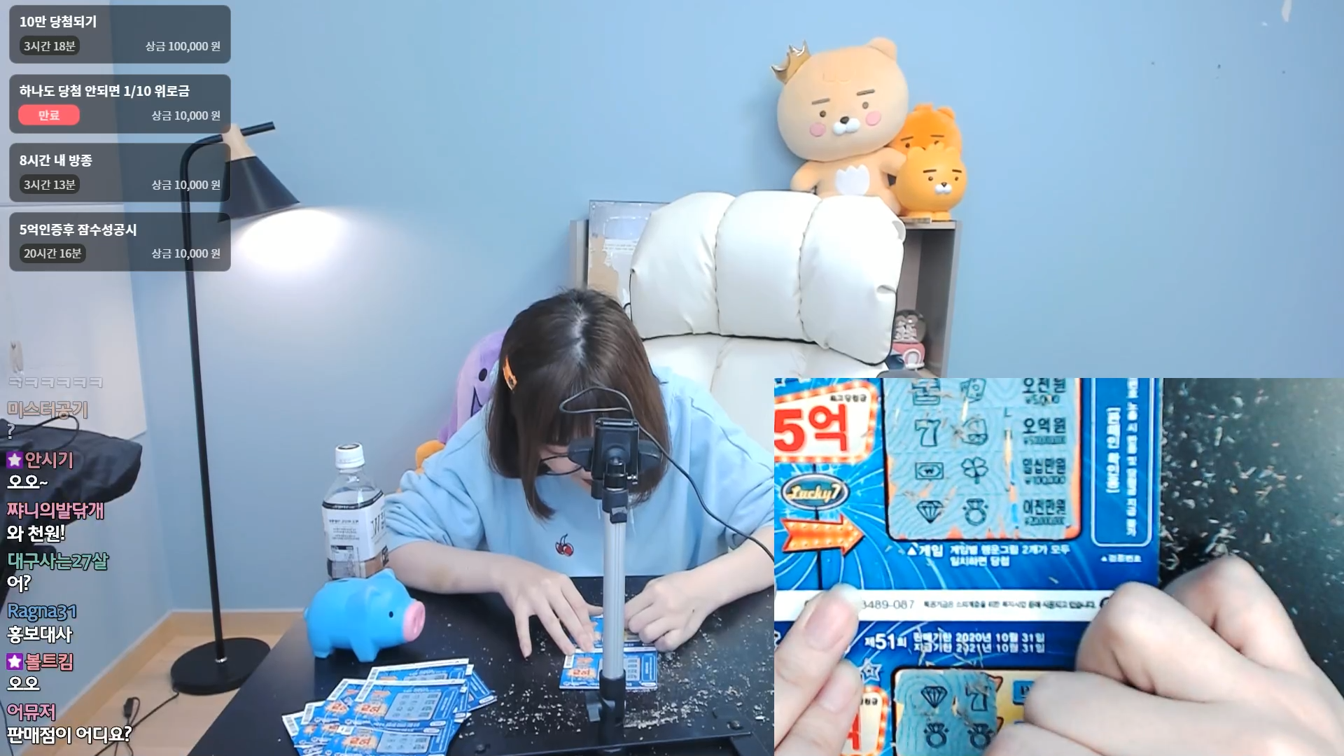 오후 7시경 방송을 시작한 루시아는 10만원 어치의 복권을 구입해왔고 복권 긁기를 진행했다.