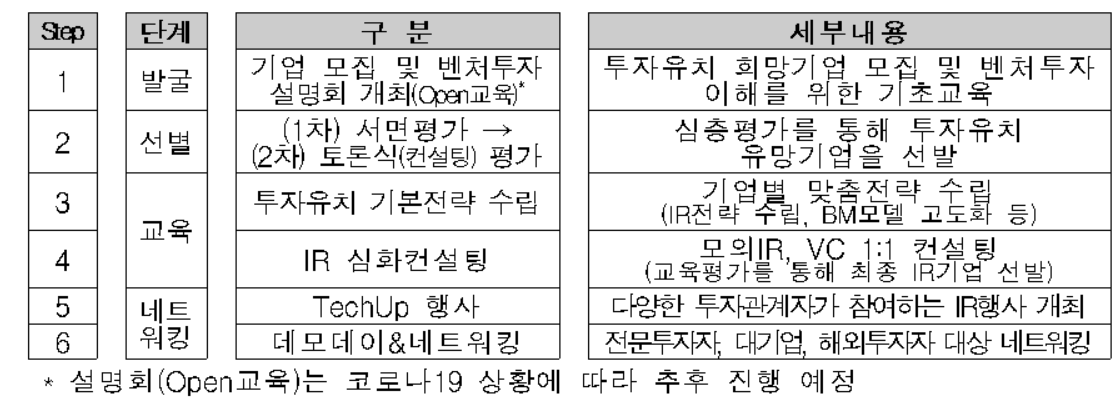 투자 유치를 희망하는 기업들을 모집해 투자유망기업을 발굴 및 육성하는 것이 목표다.