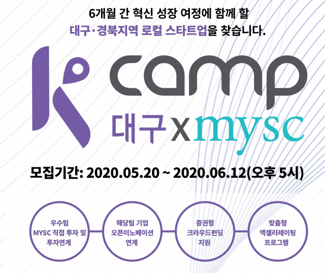 ‘K-CAMP 대구’는 대구경북 소재 스타트업을 모집해 6개월 동안 중소벤처기업부에 등록된 전문 엑셀러레이터 MYSC(Merry Year Social Company)와 함께 스타트업의 혁신성장을 지원한다.