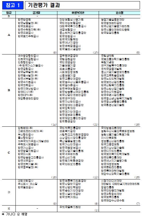 ‘우수’ 기관 21곳은 ▲한국감정원 ▲한국남동발전(주) ▲한국도로공사 ▲한국수력원자력(주) ▲한국조폐공사 ▲한국토지주택공사 ▲건강보험심사평가원 ▲국민건강보험공단 ▲대한무역투자진흥공사 ▲예금보험공사 ▲중소벤처기업진흥공단 ▲한국관광공사 ▲한국국제협력단 ▲한국에너지공단 ▲한국주택금융공사 ▲한국철도시설공단 ▲농업기술실용화재단 ▲한국광해관리공단 ▲한국산업기술평가관리원 ▲한국식품안전관리인증원 ▲한국임업진흥원 등이다.