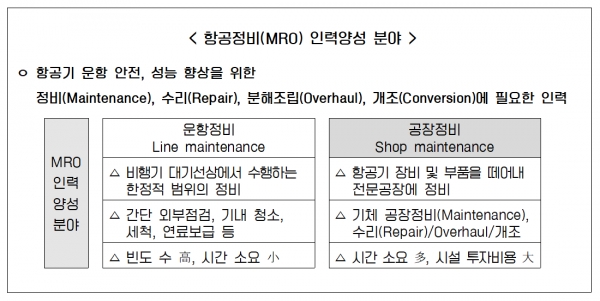 2021년 3월 운영을 목표로 ‘항공 MRO 글로벌과정’은 일반 운항정비 뿐만 아니라 항공기 개조 기술을 포함한 공장정비 능력까지 갖춘 정비 인력을 키우는게 목표다.