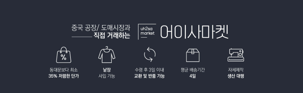 어이사마켓은 국내 소매업자가 중국 도매시장에서 직접 도매가에 의류를 구매할 수 있어 국내 도매가보다 35% 이상의 단가 절감을 할 수 있다.