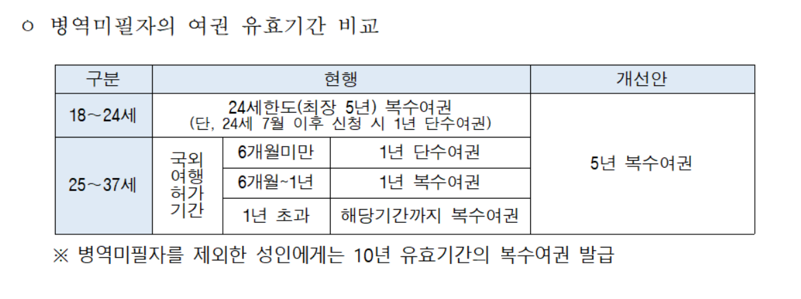 현행 제도에 따르면 18~24세 사이의 병역미필자는 24세 한도로 제한하고, 25~27세인 경우 국외여행허가기간에 따라 1년 내외로 제한된 유효기간을 부여한 여권을 발급했다.