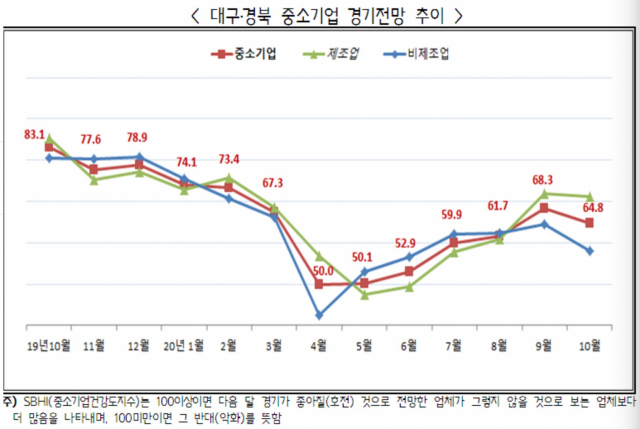 중소기업중앙회 대구경북지역본부에 따르면, 지난 9월 15일부터 9월 21일까지 대구경북 중소기업 374곳을 대상으로 2020년 10월 경기전망조사를 실시했다.