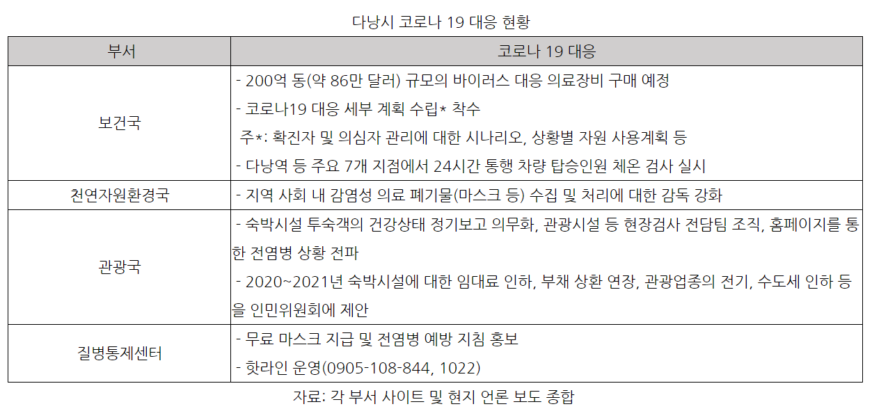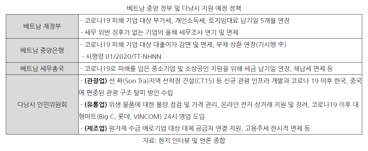 다낭시 까오 찌 융(Cao Tri Dung) 관광협회장은 “코로나19 사태로 6월까지 약 7억 달러의 피해가 예상되고 사태가 장기화되면 피해애 추산조차 가늠하기 어렵다.”라고 말하면서 토지 임대료 인하나 소득세 감면 등을 정부에 요청했다.