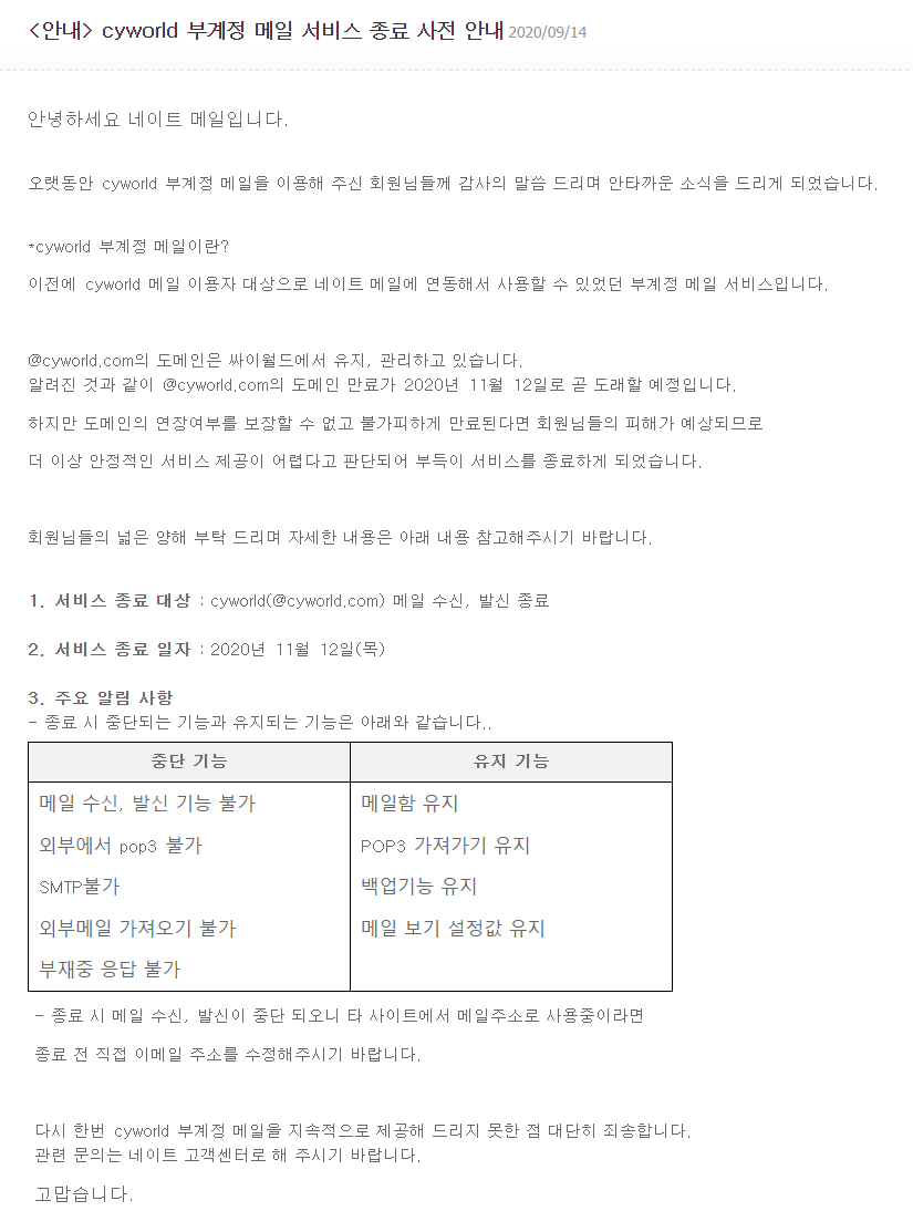 네이트 측은 싸이월드의 도메인이 만료됨에 따라 네이트 메일에서 제공해주던 이메일 서비스를 제공할 수 없다고 공지하고, 이전에 왔던 이메일 함은 유지된다.