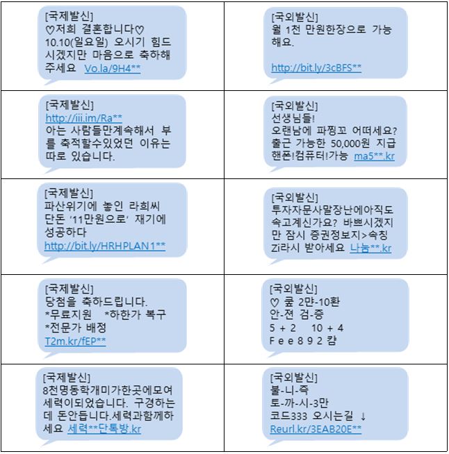 또한, 이용자는 이동통신사의 국제전화 수신거부 서비스에 무료로 가입하고, 휴대전화 차단문구(국제발신, 국외발신)를 설정하는 방법 등을 통해 사전에 스팸문자를 차단할 수 있다.