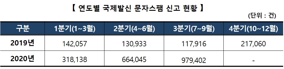 2020년 9월까지 KISA는 불법스팸대응센터로 접수된 국제발신 문자 스팸신고 건수는 모두 1,961,585건으로 전년 동기 390,906 건 대비 402% 증가한 것으로 나타났다.
