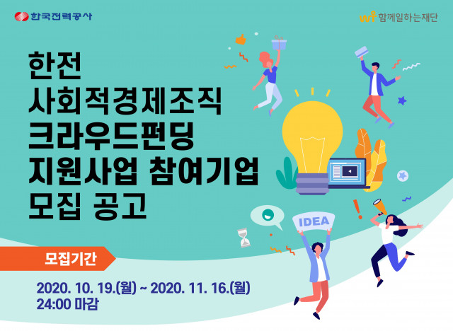 함께일하는재단과 한국전력공사가 사회적경제조직의 홍보 및 판로지원을 위한 ‘2020 한전 사회경제조직 크라우드펀딩 지원사업’에 참여할 조직을 공모한다.