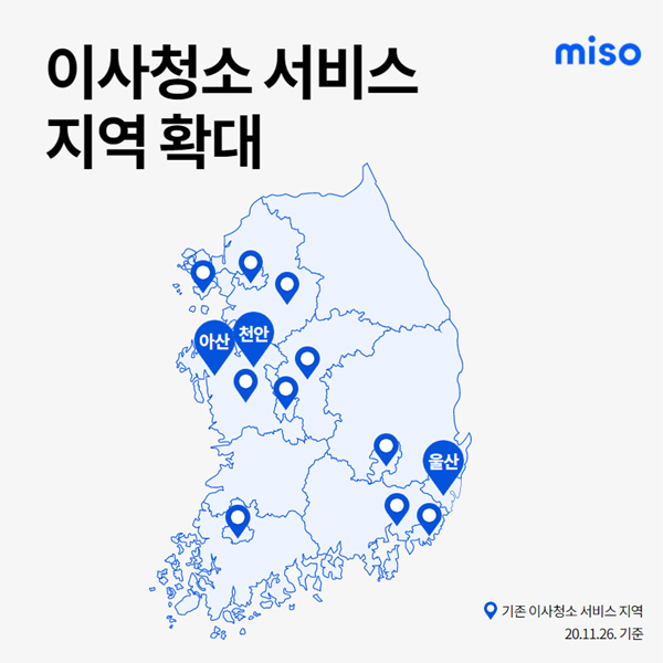 미소는 기존에 수도권, 부산, 대전에 한정된 이사청소 서비스 지역을 7월에 대구, 광주, 세종, 청주, 창원으로 확장했으며 이번에는 충남, 천안, 아산과 울사노강역시로 진출해 전국 13개 지역에서 이용할 수 있게 됐다고 밝혔다.