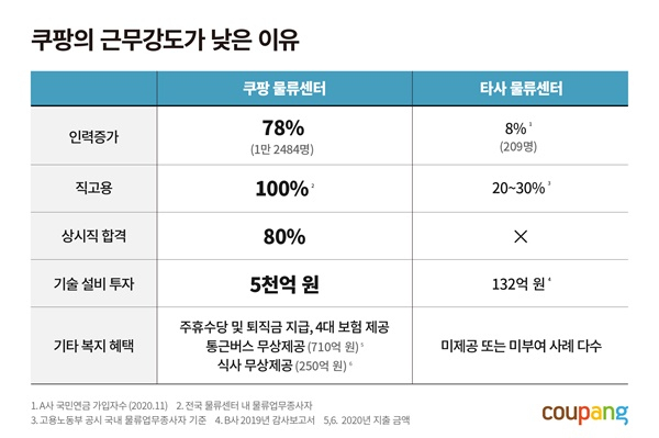 타 물류센터에서는 하청 업체에 일을 맡기는 것과 달리, 쿠팡은 전국 물류센터 내 물류업무 종사자들을 100% 직고용하고 있으며, 직고용을 통한 안정적 일자리와 충분한 복지혜택으로 국내 물류 산업 근로환경의 새로운 기준을 만들고 있다고 밝혔다.