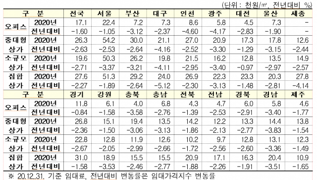 2020년 4분기 상가 임대료가 전체적으로 하락한 가운데, 대구가 전국에서 가장 큰 폭으로 하락했다.
