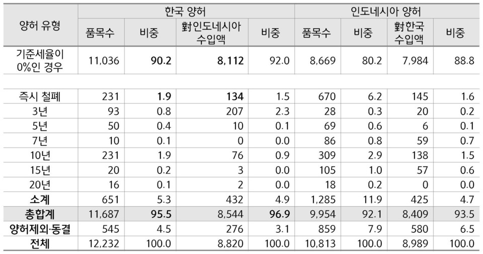 한국무역협회 국제무역통상연구원에서 발표한 ‘한-인도네시아 CEPA의 체결 효과’에 따르면 2020년 12월 18일에 체결된 한국-인도네시아 CEPA로 인도네시아는 수입품목의 92.1%, 2019년 수입액 기준 93.5%에 달하는 품목의 관세를 철폐하기로 합의했다.