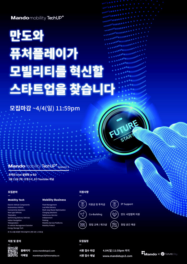 퓨처플레이(Futureplay)가 자동차 부품전문기업 만도와 함께 ‘만도 모빌리티 테크업플러스’ 시즌3를 실시한다.