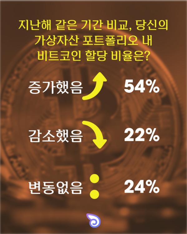 반면 ‘감소했다’고 답한 응답자는 22%를 기록하였으며, 24%는 비트코인 할당비율에 변동이 없다고 답했다.
