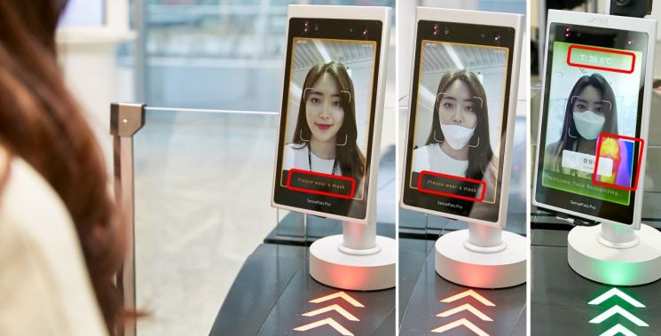 시스템은 얼굴의 생김새에 눈, 코, 입 등을 집중 분석해 사람을 구별하는 얼굴인식 AI 기술이로, 직원 신분을 판독하면서 마스크 착용 여부를 추가로 판별해 통과 인증을 해준다.