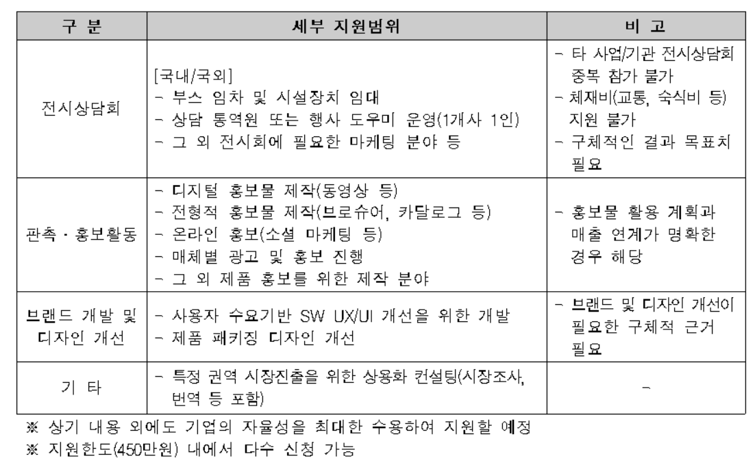 또한, 판매 가능한 제품 또는 서비스를 보유하고 국내외 마케팅 활동을 통해 기업 매출 증대 계획이 명확한 지역기업이고 중소기업기본법 제 2조의 규정에 의한 중소기업이 대상이다.