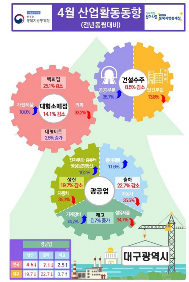 지난 5월 29일 동북지방통계청이 발표한 ‘4월 대구경북 산업활동동향’에 따르면, 대구의 광공업 생산은 전년 동기 대비 19.7% 감소했다.