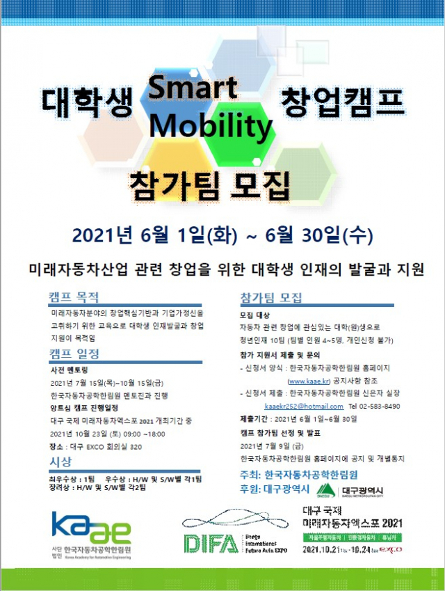 한국자동차공학한림원의 창업프로그램을 메인으로 대구광역시가 후원하는 이번 사업은 1대1 전담지도 및 현장 경험 공유를 통해 미래자동차 인재 양성을 목표로 한다.