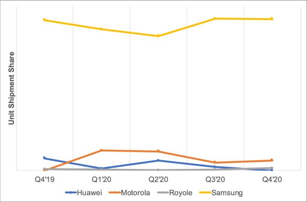 시장조사기관인 디스플레이 서플라이 체인 컨설턴트(Display Supply Chain Consultant, DSCC)에 따르면, 삼성전자는 지난 2월 출시한 갤럭시 Z 플립과 9월 출시한 갤럭시 Z 폴드2를 앞세워 글로벌 폴더블폰 시장을 공략한 결과 88%의 점유율을 차지했다.