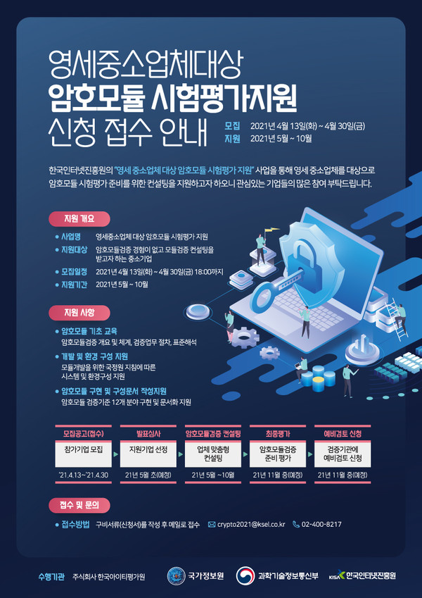 이번 컨설팅은 암호모듈검증 경험이 없는 영세·중소업체면 누구나 신청할 수 있으며, 관련 제출서류를 구비해 오는 4월 30일(금)까지 이메일로 접수하면 된다. 자세한 사항은 암호이용활성화 누리집을 통해 확인할 수 있다.
